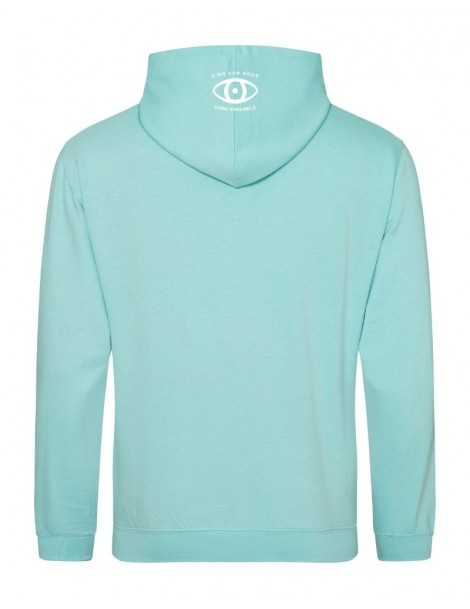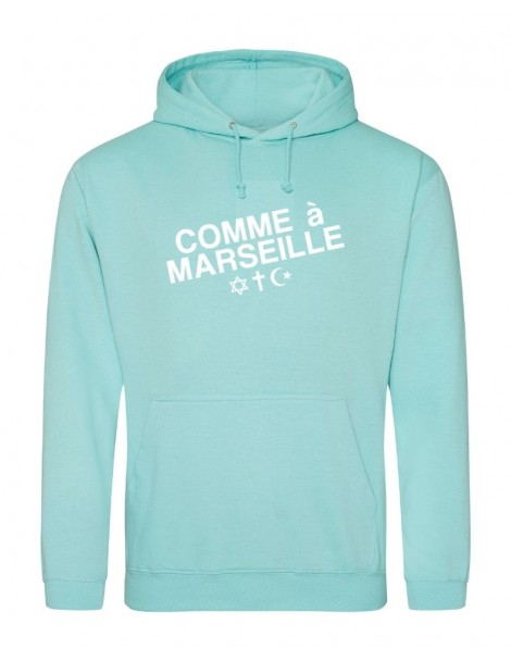 SWEAT-SHIRT à capuche, MINT (turquoise), 80% Coton 20% Polyester, 280grs, coupe classique. Impression "transfert sérigraphique" blanche faite à Marseille. Logo 'COMME À MARSEILLE' devant. Logo Œil 'Vivre Ensemble' au dos (capuche).